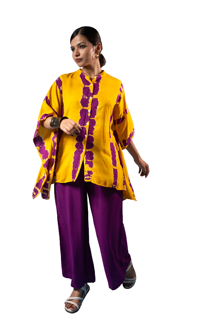 Add a pop of vibrant elegance to your wardrobe with this stylish two-piece co-ord set. The kaftan-style top features a bold tie-dye pattern in rich mustard yellow and deep plum tones, designed with a button-down front and dramatic, flowy sleeves for a statement silhouette. Complemented by solid plum wide-leg palazzo pants, this set blends comfort with contemporary flair.
