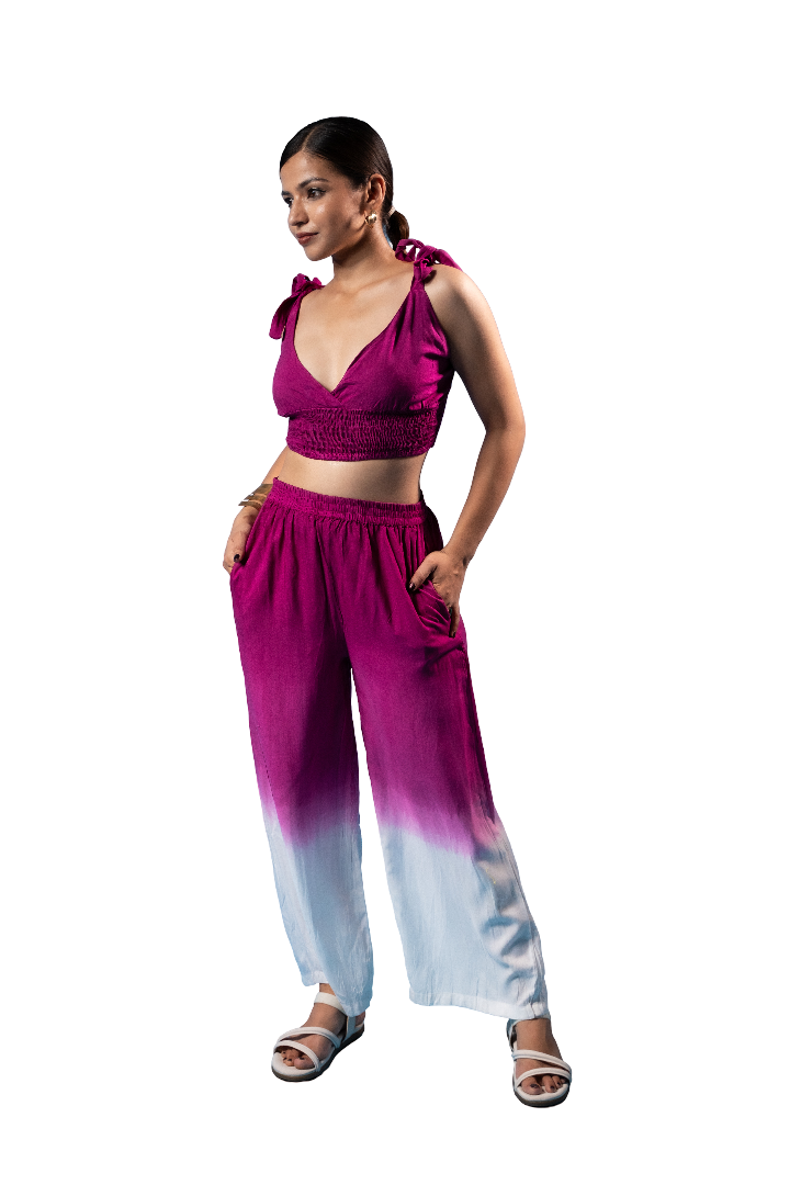 The sleeveless V-neck crop top comes with a smocked waist for a flattering fit and stylish tie-up shoulder details that add a modern touch. The high-waist palazzo pants feature a soft elastic waistband and side pockets, ensuring ease of movement and everyday comfort. The graceful wine-to-white ombre gradient enhances the overall look, making it perfect for both casual and semi-dressy occasions.